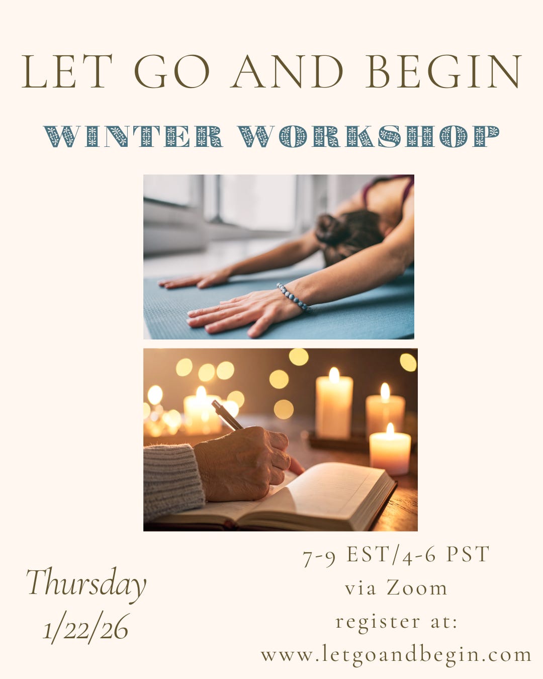 nudge: our Let Go & Begin Winter Workshop is coming up — Thursday, January 22nd, 4–6 pm PT (7–9 pm ET). We’ll meet the winter where it is with grounding yoga and guided journaling designed to help you clear the noise and begin again.